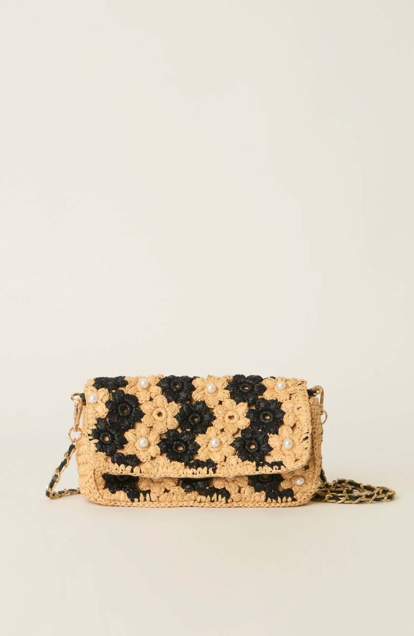 Playful yet polished, the Shiloh Flower Crossbody adds a touch of elegance to your everyday look. Handmade in India from 100% natural raffia, this lightweight and durable bag features a black-and-white floral design and delicate pearl embellishments for a subtle, sophisticated sparkle. Perfect for both casual outings and special occasions, it's a versatile piece that elevates any outfit.
