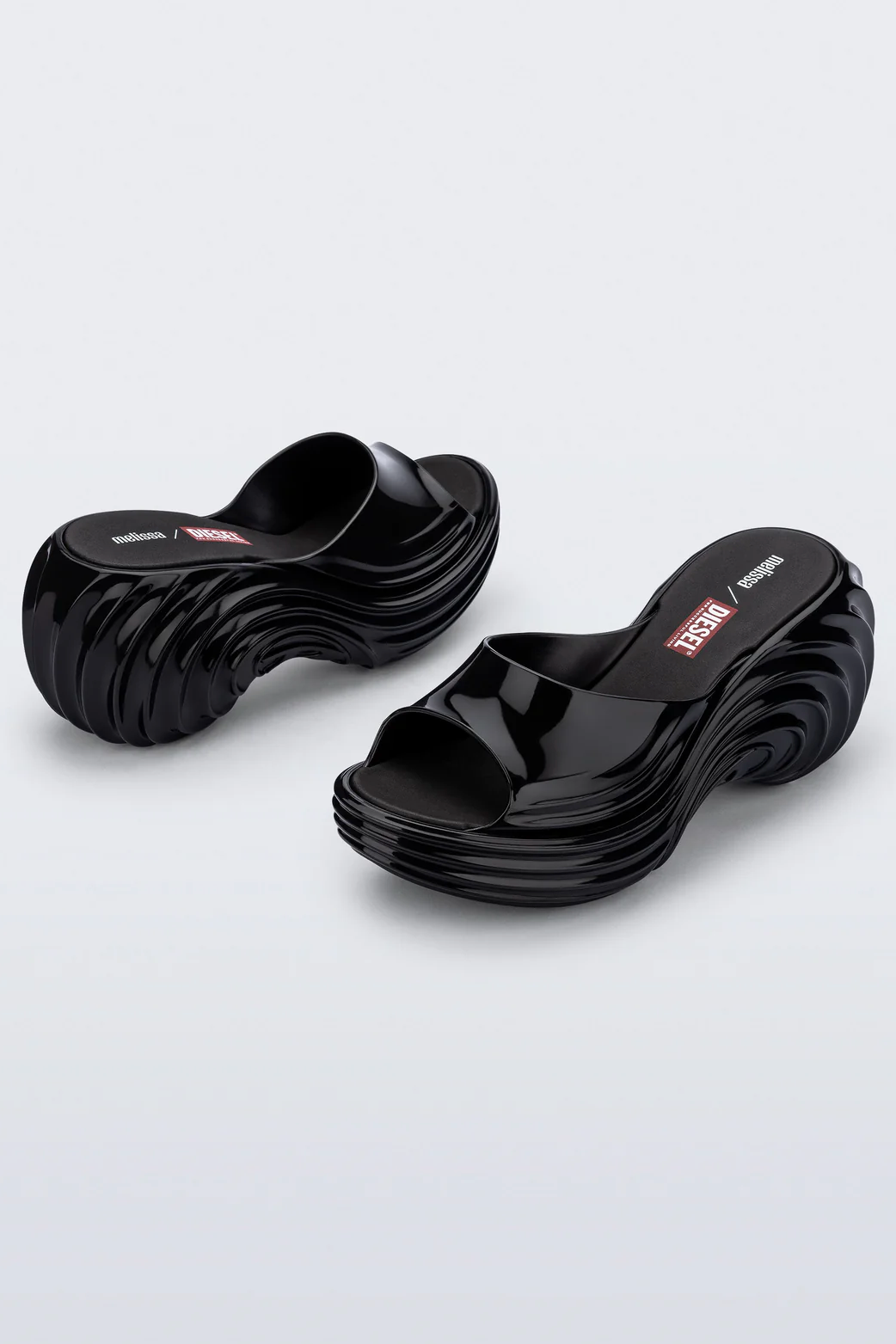 The Melissa/Diesel collection introduces the future of footwear with the Quantum Platform. Parametric design and optical art influence the bold aesthetic of this futuristic, elevated sandal, fusing innovation with algorithmic inspiration. The design is a testament to bold creativity and meticulous execution, with a flawless combination of sophisticated color palettes, modern textures, and advanced technologies. Signature to the collection is the Diesel “D” monogram, re-imagined as a striking aesthetic element that perfectly enhances the dynamic and contemporary character of the designs.