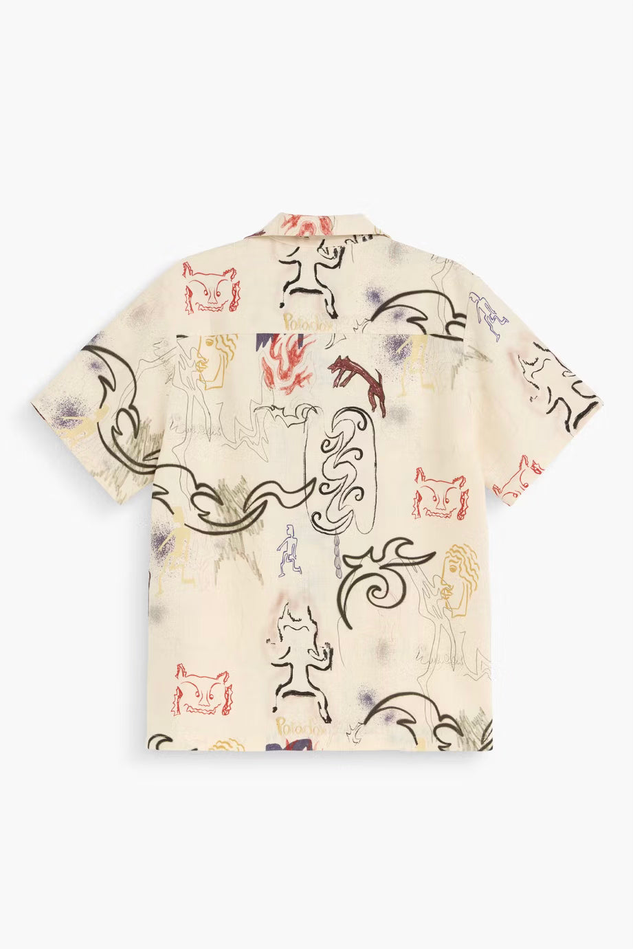 Ivory linen shirt with multicolour abstract line drawings and swirling motifs. Lightweight texture with a relaxed drape, resort collar and dropped shoulders.