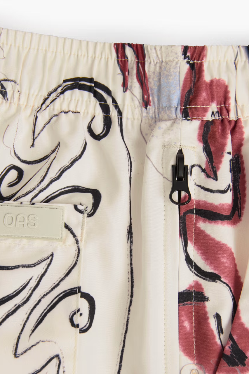 Ivory swim shorts with abstract multicolour line drawings and swirling shapes. Lightweight, quick-drying fabric with mesh lining and elastic waist.
