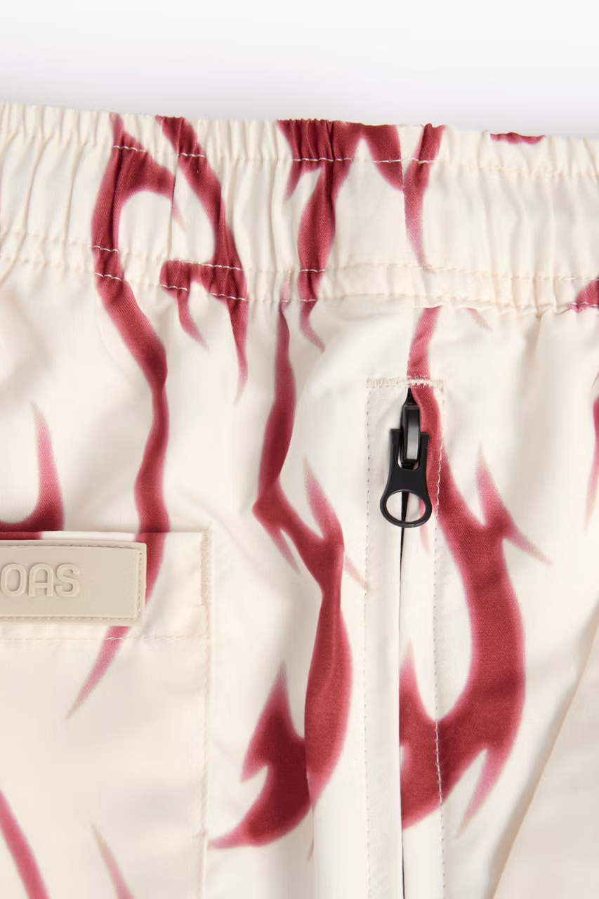 Swim shorts in lightweight quick-drying fabric printed with red flame pattern. Elastic waist with four pockets including a hidden zip pocket. Mesh lining for comfort. Tailored fit and mid-rise.